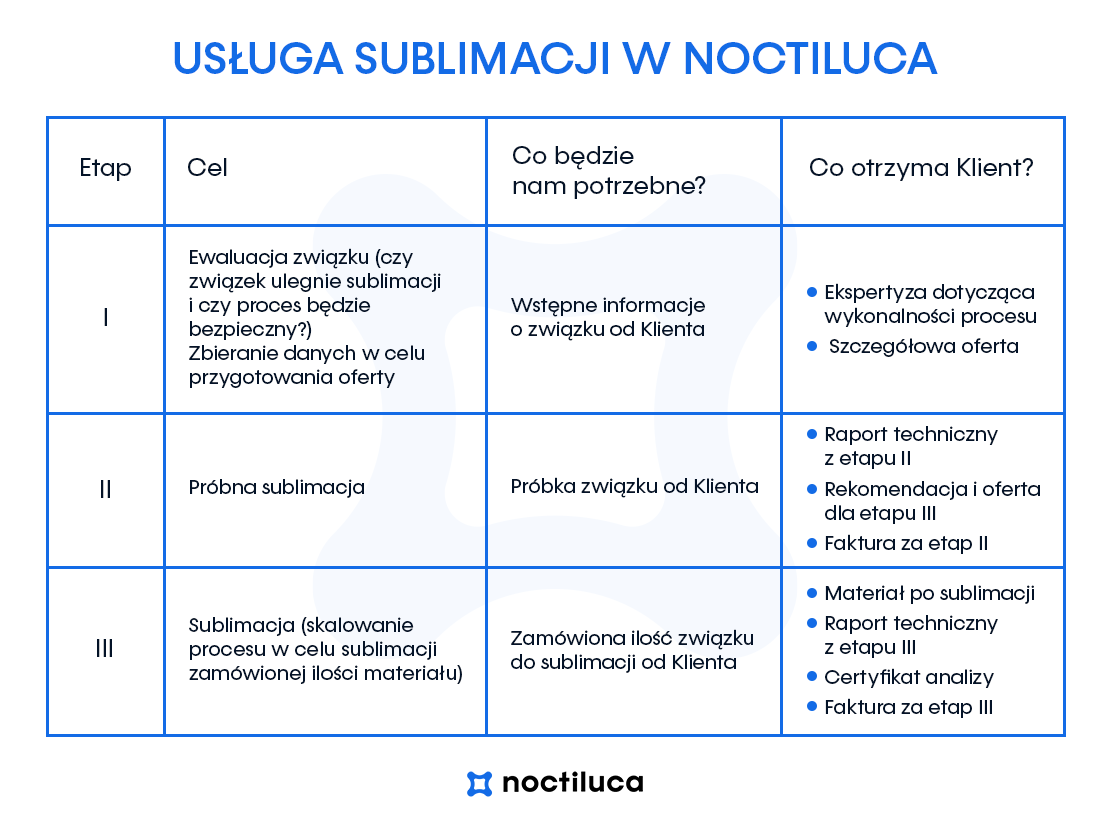 W Noctiluca specjalizujemy się w zaawansowanej usłudze sublimacji. Dzięki najnowocześniejszemu sprzętowi, w jaki wyposażone jest nasze laboratorium, oraz specjalistycznej wiedzy naszych ekspertów, zapewniamy najwyższy poziom czystości i jakości produktu końcowego. Posiadamy wiedzę i zasoby, by skutecznie przeprowadzić proces sublimacji. Oto, jak wygląda usługa sublimacji w Noctiluca: